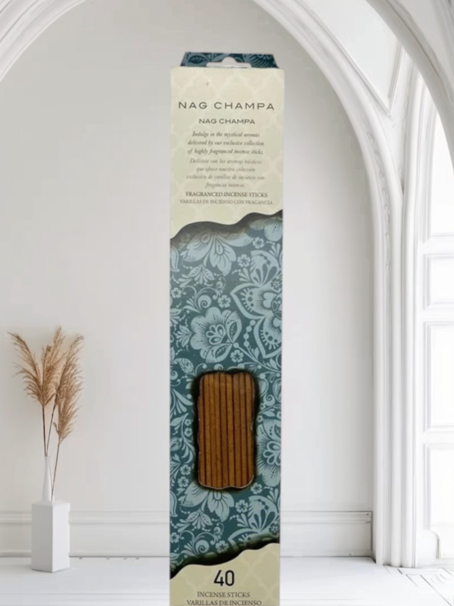 Indulge in the mystical aromas delivered by this exclusive collection of our highly fragranced 40 Count Nag Champa Incense Sticks. This 40-pack of incense helps create a relaxed and zen-like atmosphere.