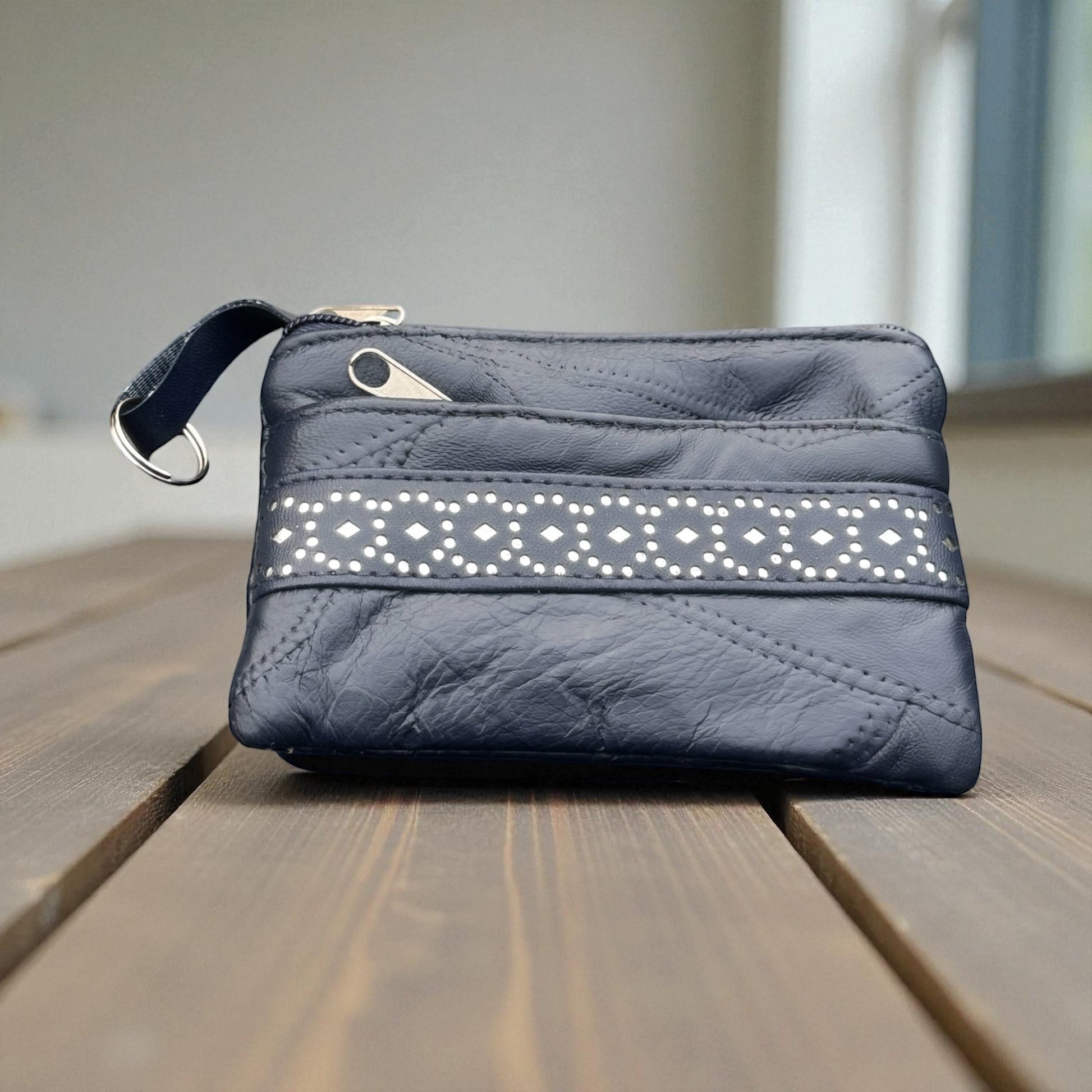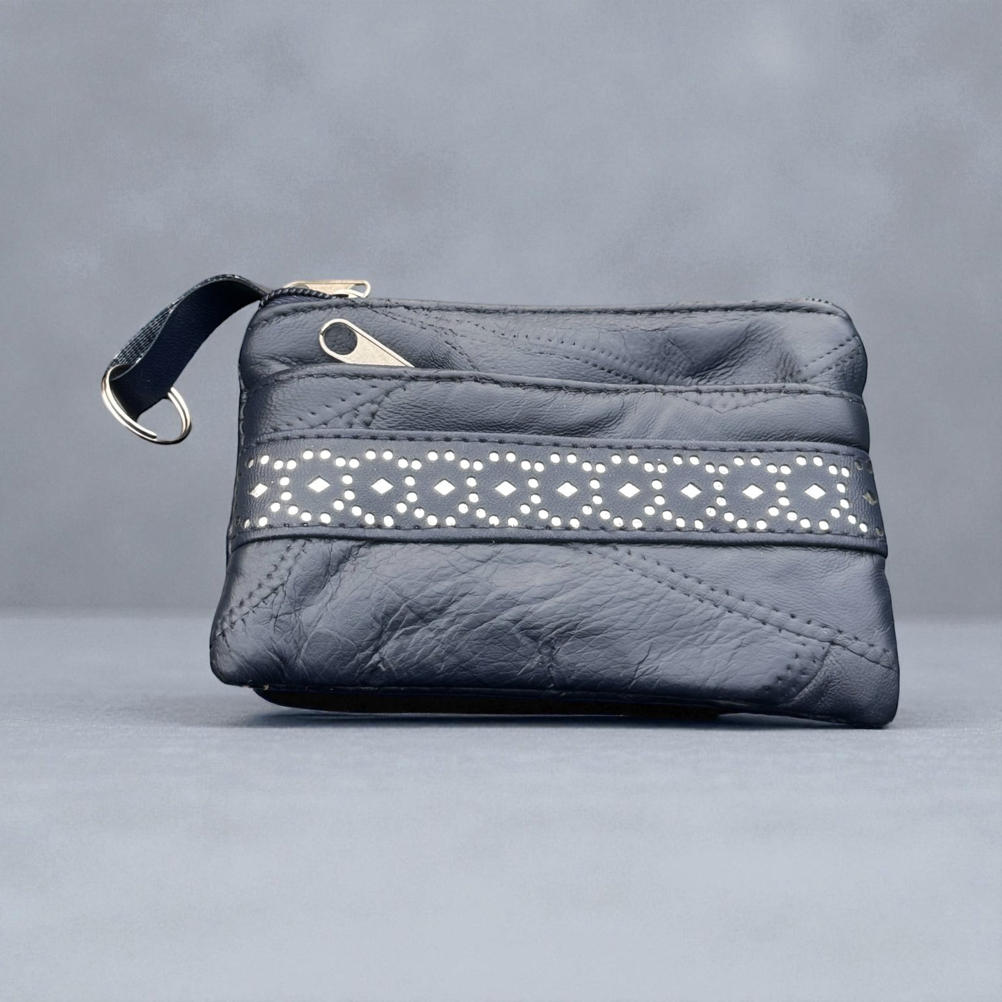 Made from patch leather, our Blue Zip Purse With Silver Pattern is stylish and functional. The attractive design on the outside breaks it up with a fresh and flashy attitude.