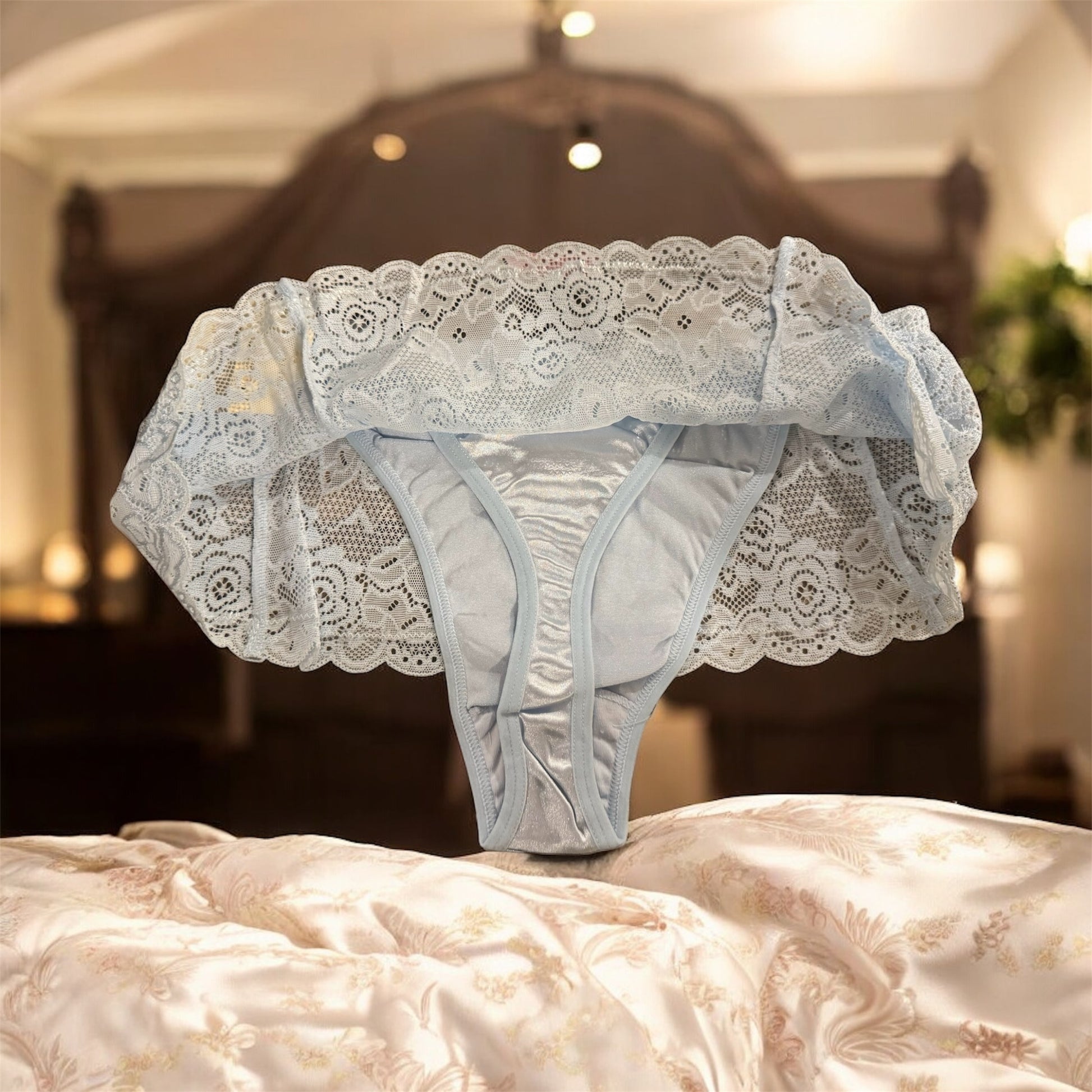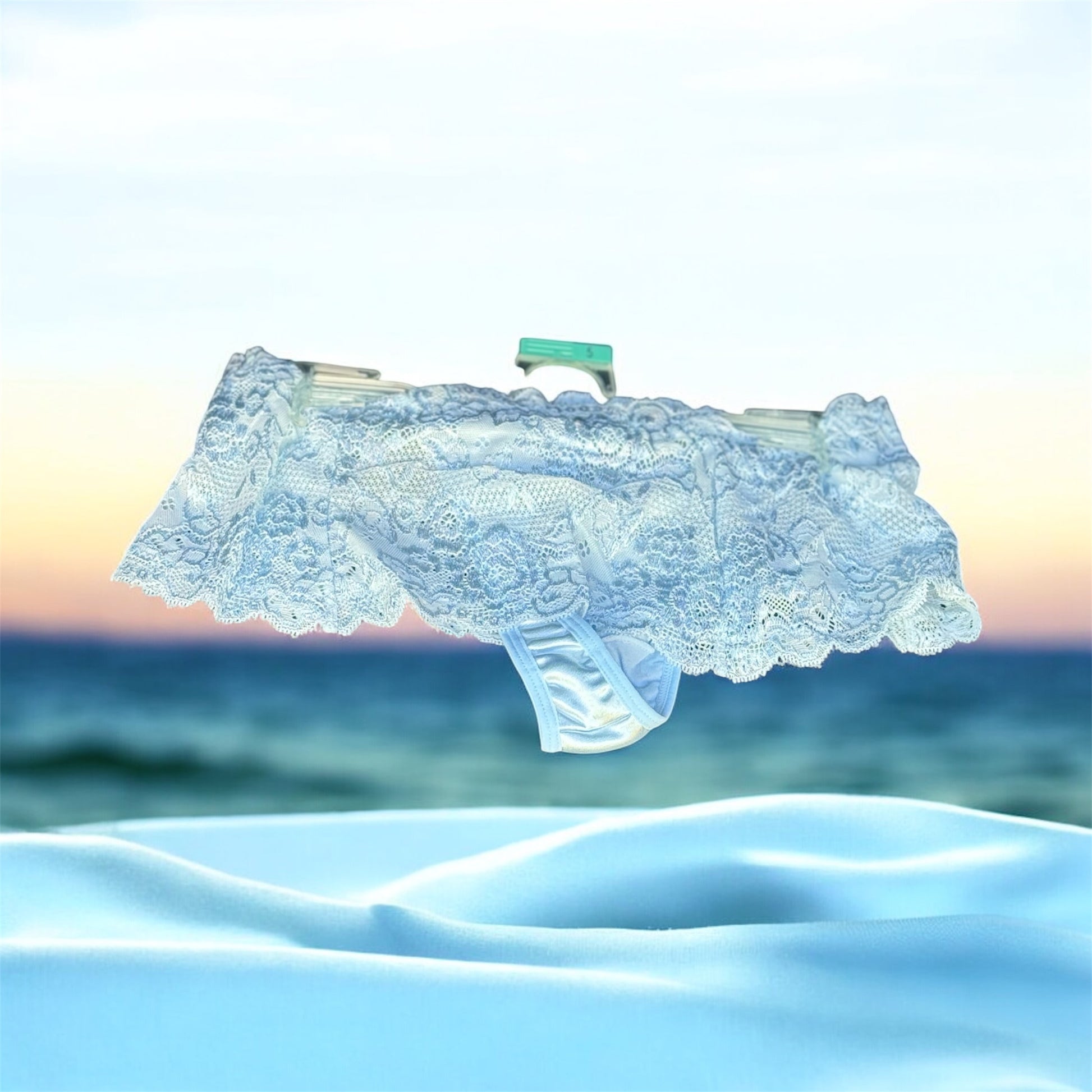For the ladies who are looking for soft comfort with a side of naughty, our Light Blue Stretch Lace Underwear Thong will keep you happy. These "skongs" are a cross between a thong and lacey skirt. The color is Bonnie blue and each unit is already pre-hung on a hanger.