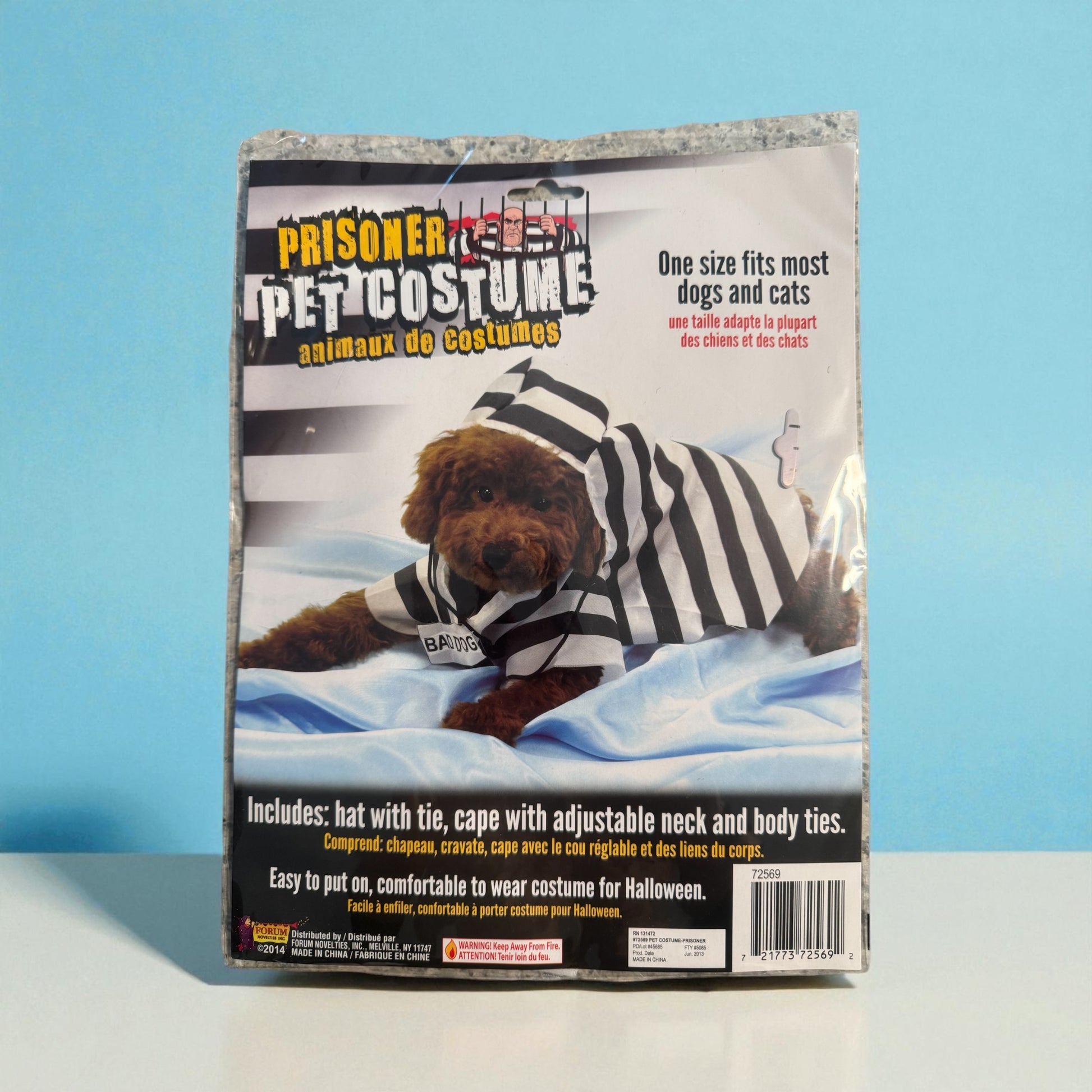 Each costume is made of very comfortable material guaranteed not to disturb your furry companion. The Prisoner Pet Costume is a black and white striped hat with tie, and a cape with adjustable neck and body ties so lightweight, he/she won't even know it's one or that any trouble is afoot!